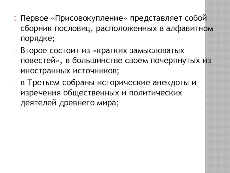 Слайд 24Первое «Присовокупление» представляет собой сборник пословиц, расположенных в алфавитном порядке;