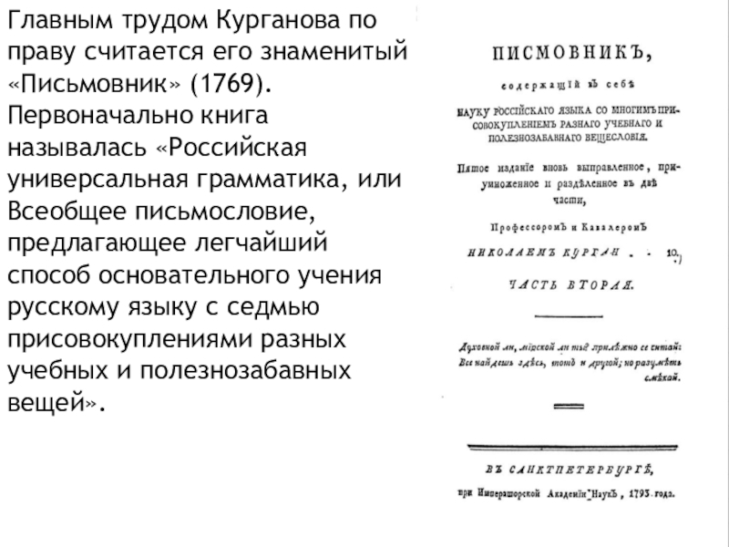 Слайд 21Главным трудом Курганова по праву считается его знаменитый «Письмовник» (1769). Первоначально