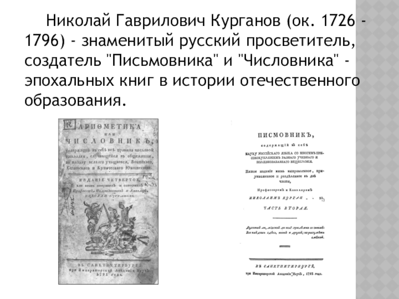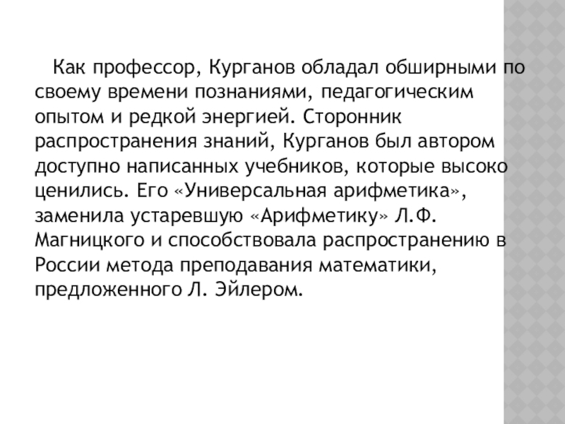 педагогическим опытом и редкой энергией. Сторонник распространения знаний, Курганов был автором доступно написанных учебников, которые высоко ценились. Его «Универсальная арифметика», заменила устаревшую «Арифметику» Л.Ф. Магницкого и способствовала распространению в России метода преподавания математики, предложенного Л. Эйлером.