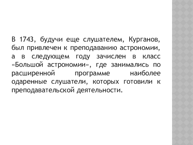 Слайд 5В 1743, будучи еще слушателем, Курганов, был привлечен к преподаванию астрономии,