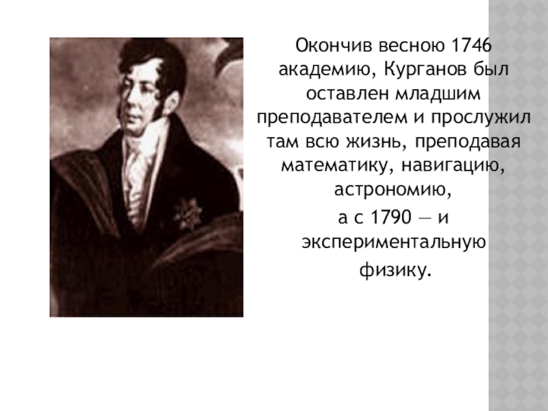 Слайд 6Окончив весною 1746 академию, Курганов был оставлен младшим преподавателем и прослужил