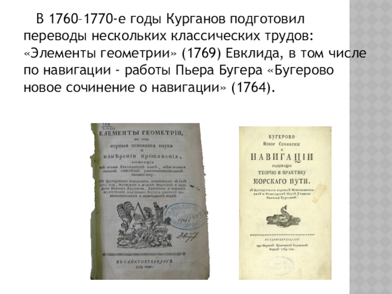 «Элементы геометрии» (1769) Евклида, в том числе по навигации - работы Пьера Бугера «Бугерово новое сочинение о навигации» (1764).