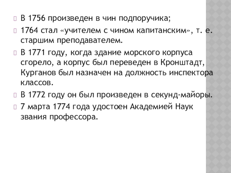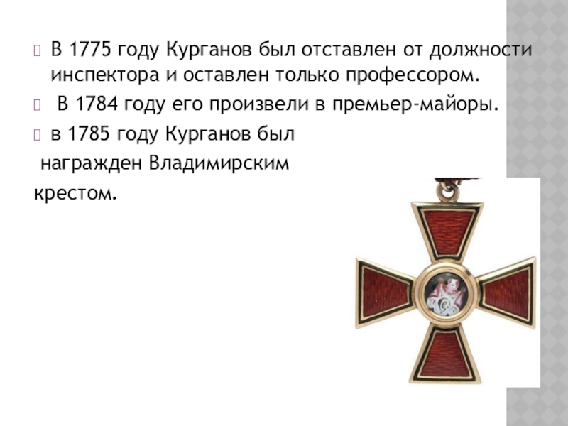 Слайд 10В 1775 году Курганов был отставлен от должности инспектора и оставлен