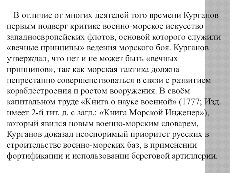 подверг критике военно-морское искусство западноевропейских флотов, основой которого служили «вечные принципы» ведения морского боя. Курганов утверждал, что нет и не может быть «вечных принципов», так как морская тактика должна непрестанно совершенствоваться в связи с развитием кораблестроения и ростом вооружения. В своём капитальном труде «Книга о науке военной» (1777; Изд. имеет 2-й тит. л. с загл.: «Книга Морской Инженер»), который явился новым военно-морским словарем, Курганов доказал неоспоримый приоритет русских в строительстве военно-морских баз, в применении фортификации и использовании береговой артиллерии.