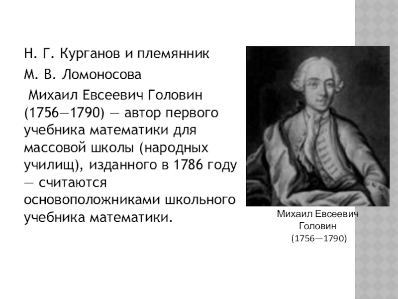 (1756—1790) — автор первого учебника математики для массовой школы (народных училищ), изданного в 1786 году — считаются основоположниками школьного учебника математики.