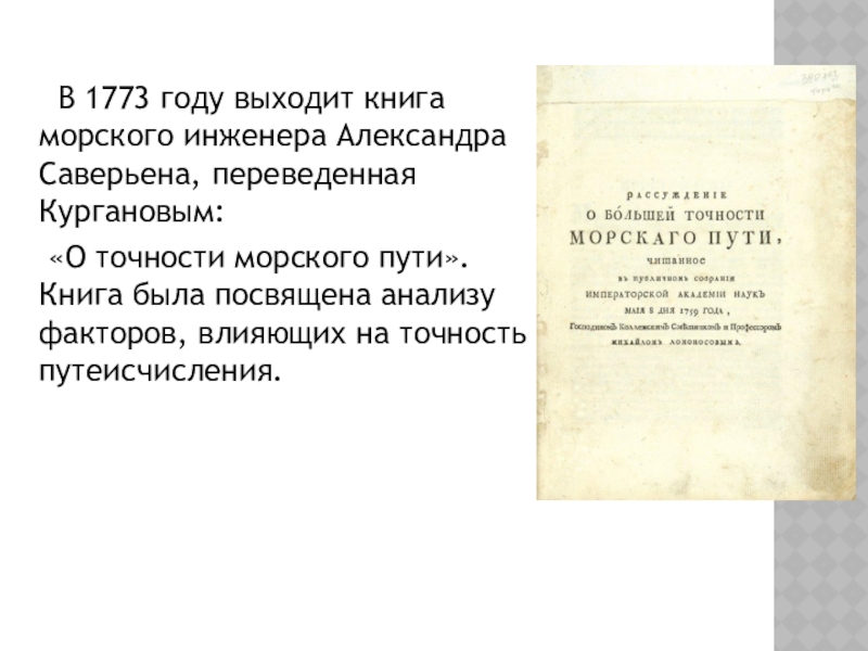 Слайд 14 В 1773 году выходит книга морского инженера Александра Саверьена, переведенная
