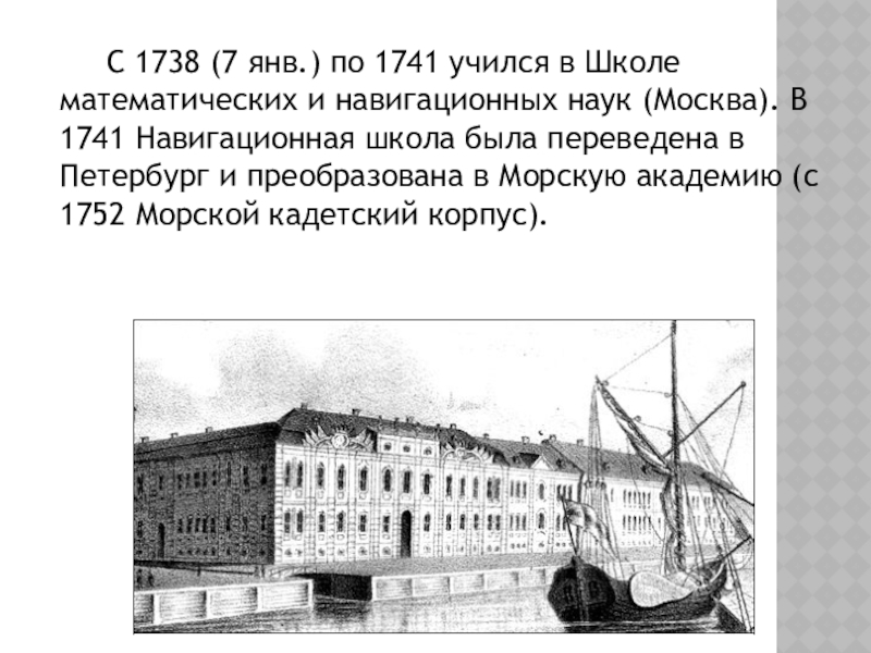 Школе математических и навигационных наук (Москва). В 1741 Навигационная школа была переведена в Петербург и преобразована в Морскую академию (с 1752 Морской кадетский корпус).
