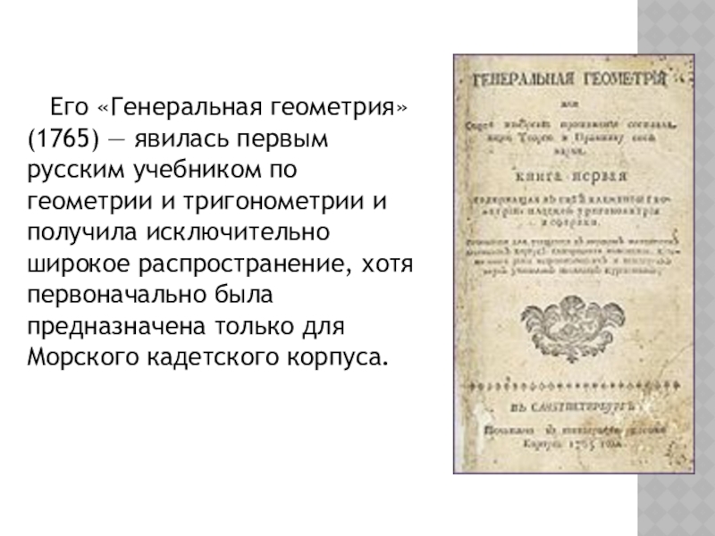 Слайд 19 Его «Генеральная геометрия» (1765) — явилась первым русским учебником
