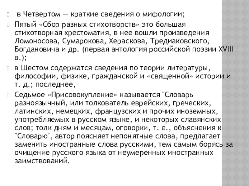 стихотворств» это большая стихотворная хрестоматия, в нее вошли произведения Ломоносова, Сумарокова, Хераскова, Тредиаковского, Богдановича и др. (первая антология российской поэзии XVIII в.);