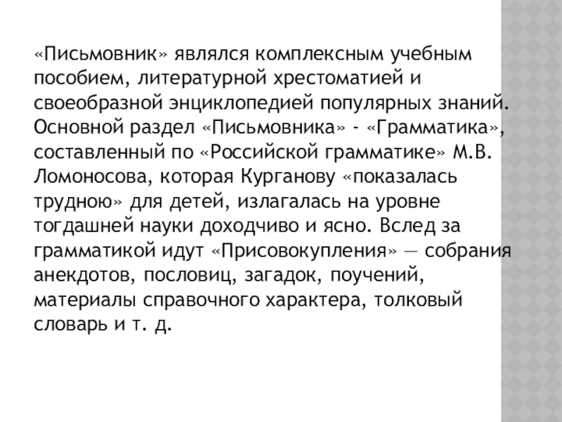 знаний. Основной раздел «Письмовника» - «Грамматика», составленный по «Российской грамматике» М.В. Ломоносова, которая Курганову «показалась трудною» для детей, излагалась на уровне тогдашней науки доходчиво и ясно. Вслед за грамматикой идут «Присовокупления» — собрания анекдотов, пословиц, загадок, поучений, материалы справочного характера, толковый словарь и т. д.