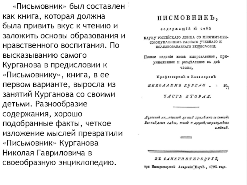 вкус к чтению и заложить основы образования и нравственного воспитания. По высказыванию самого Курганова в предисловии к «Письмовнику», книга, в ее первом варианте, выросла из занятий Курганова со своими детьми. Разнообразие содержания, хорошо подобранные факты, четкое изложение мыслей превратили «Письмовник» Курганова Николая Гавриловича в своеобразную энциклопедию.