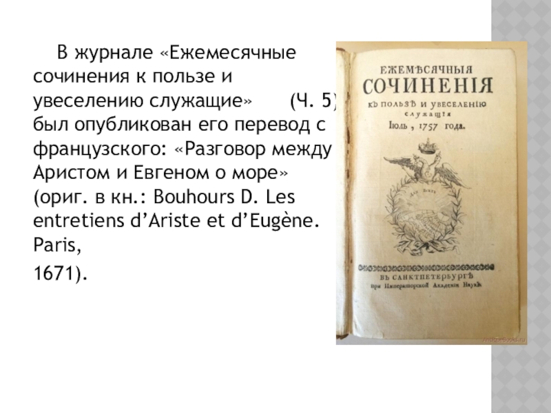 (Ч. 5) был опубликован его перевод с французского: «Разговор между Аристом и Евгеном о море» (ориг. в кн.: Воuhours D. Les entretiens d’Ariste et d’Eugène. Paris,