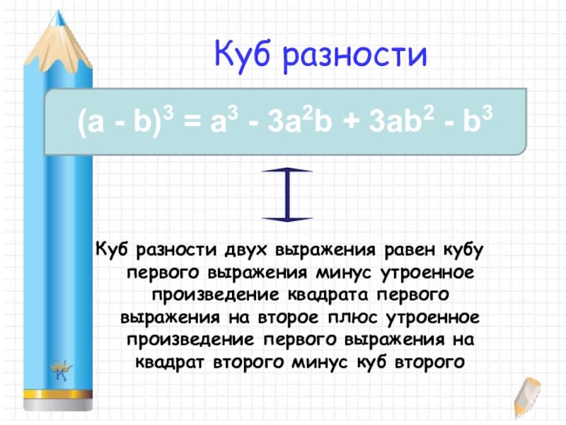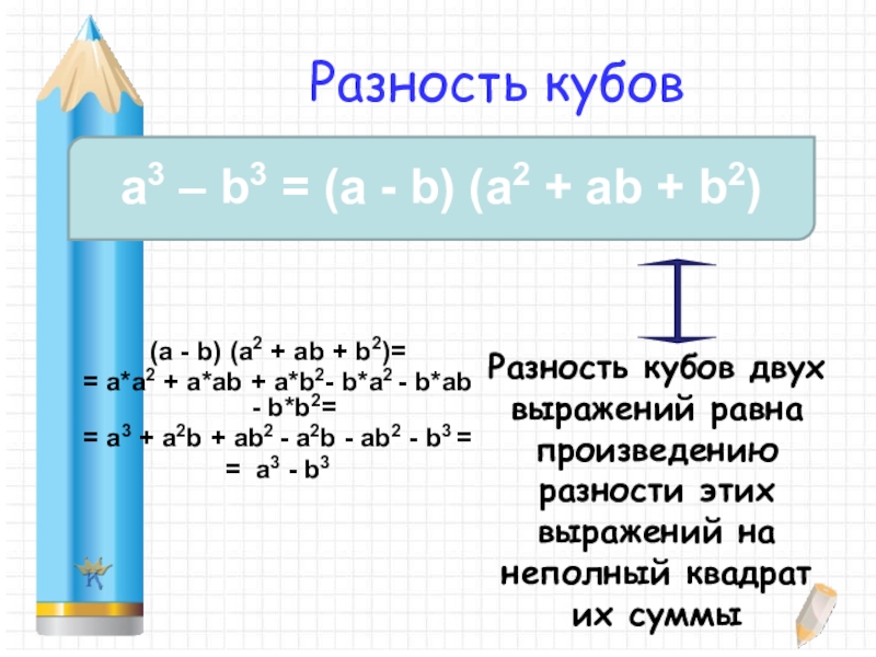 Разность кубов двух выражений равна произведению разности этих выражений на неполный квадрат их суммы