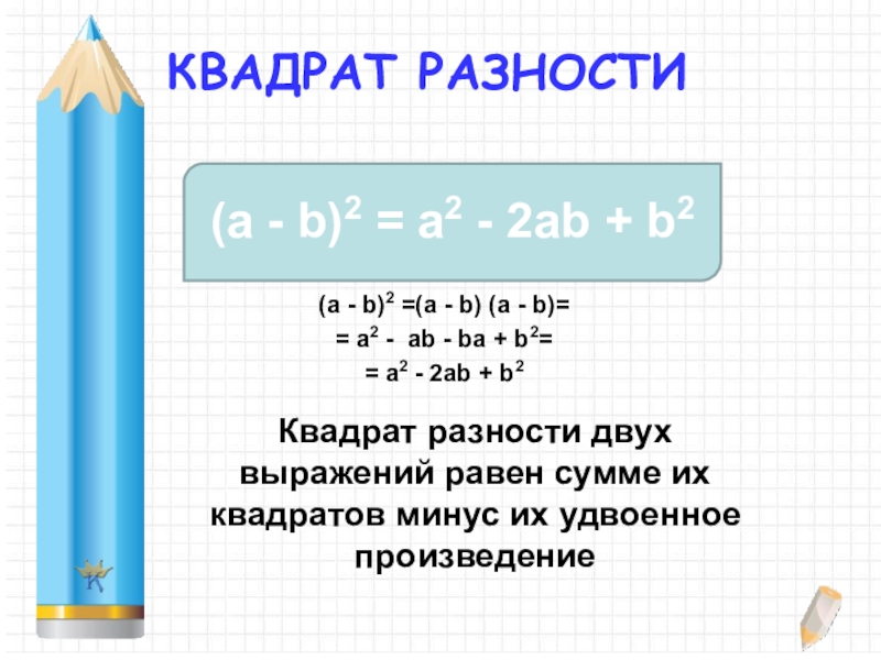 Квадрат разности двух выражений равен сумме их квадратов минус их удвоенное произведение