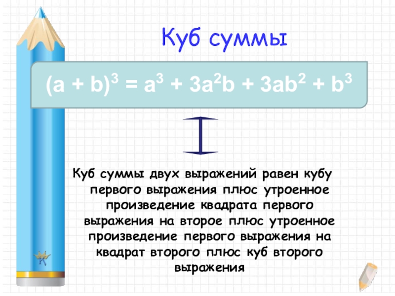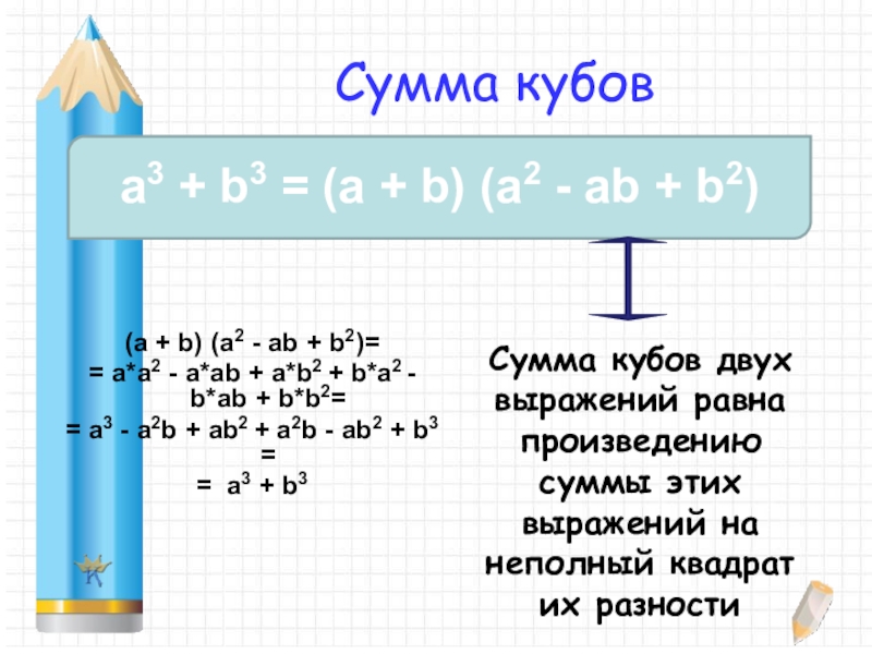 Сумма кубов двух выражений равна произведению суммы этих выражений на неполный квадрат их разности