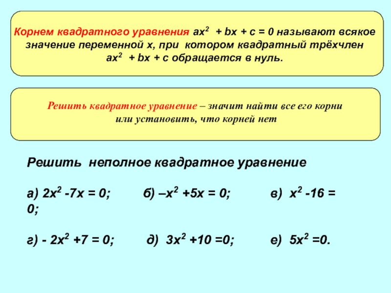 г) - 2х2 +7 = 0; д) 3х2 +10 =0; е) 5х2 =0.