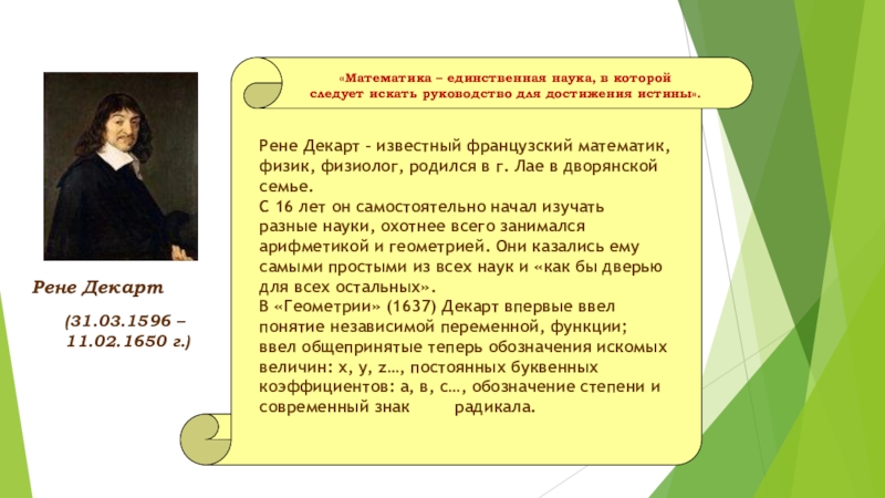 Рене Декарт – известный французский математик, физик, физиолог, родился в г. Лае в дворянской семье.