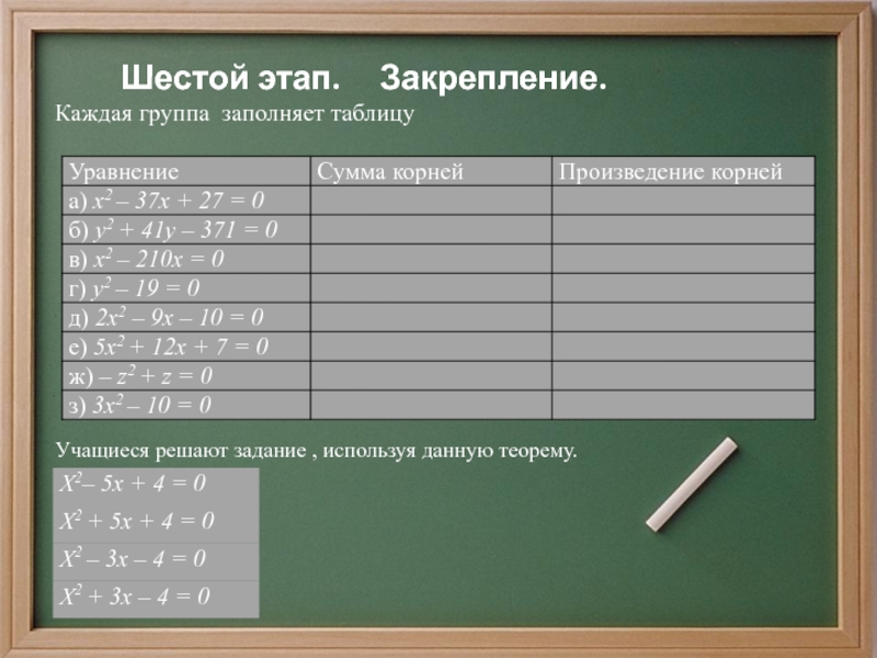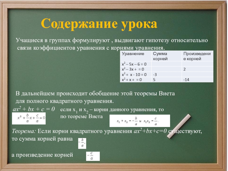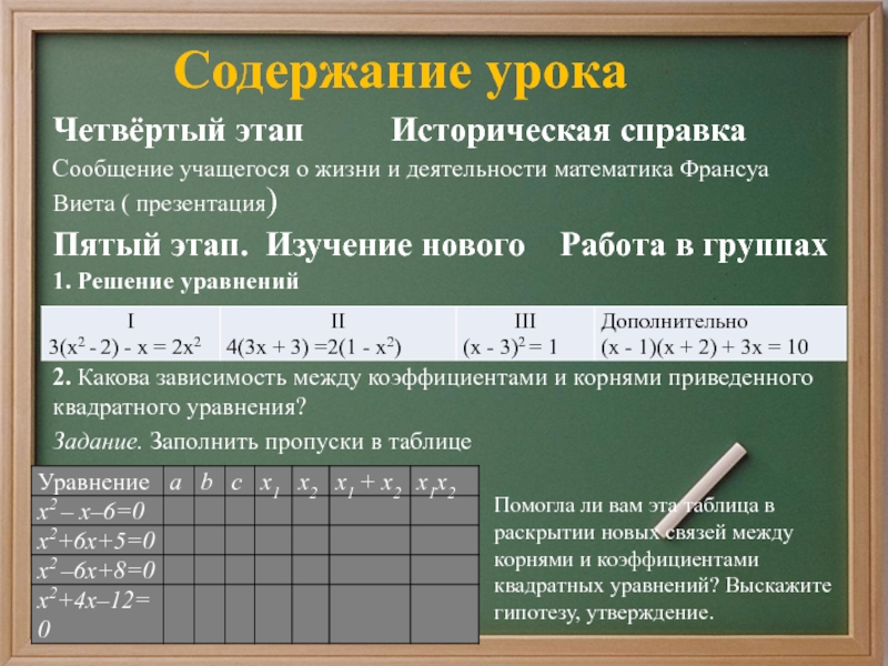 Помогла ли вам эта таблица в раскрытии новых связей между корнями и коэффициентами квадратных уравнений? Выскажите гипотезу, утверждение.