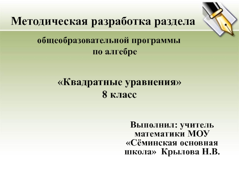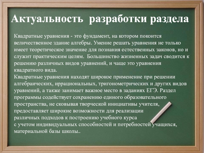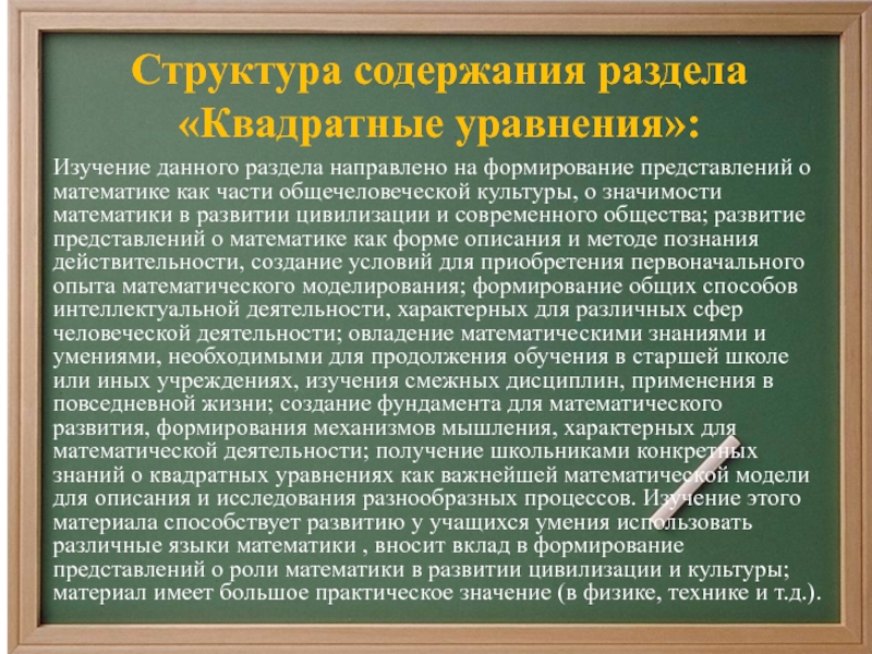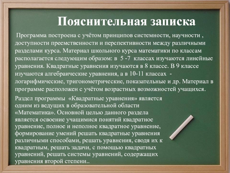 Программа построена с учётом принципов системности, научности , доступности преемственности и перспективности между различными разделами курса. Материал школьного курса математики по классам располагается следующим образом: в 5 -7 классах изучаются линейные уравнения. Квадратные уравнения изучаются в 8 классе. В 9 классе изучаются алгебраические уравнения, а в 10-11 классах - логарифмические, тригонометрические, показательные и др. Материал в программе расположен с учётом возрастных возможностей учащихся.