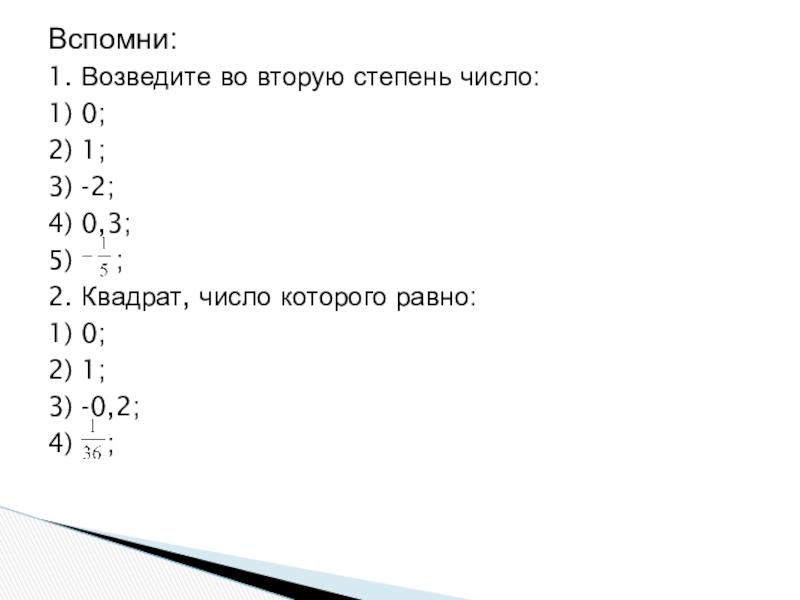 Вспомни: 1. Возведите во вторую степень число:1) 0;2) 1;3) -2;4) 0,3;5)   ;2. Квадрат, число которого