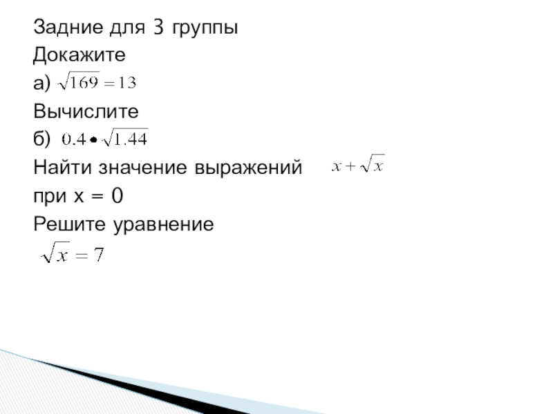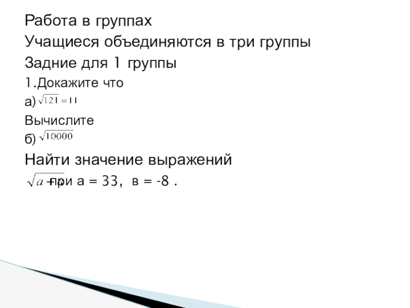 Работа в группах Учащиеся объединяются в три группыЗадние для 1 группы 1.Докажите что а) Вычислитеб) Найти значение