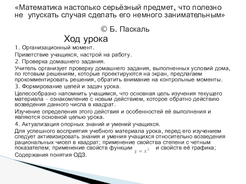 Для успешного восприятия учебного материала урока, перед его изучением следует активизировать знания и умения учащихся относительно возведения рациональных чисел в квадрат; применение свойства степени с четным показателем; применение свойств функции и свойств её графика;
