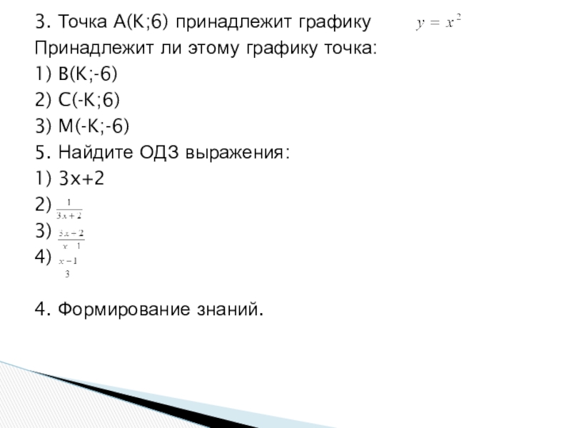 3. Точка А(K;6) принадлежит графику Принадлежит ли этому графику точка:1) B(K;-6)2) C(-K;6)3) M(-K;-6)5. Найдите ОДЗ выражения:1) 3x+22)3)4)4.