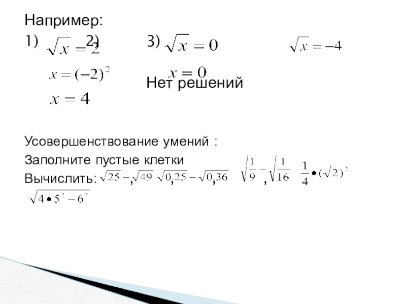 Например: 1)			2)			3)						Нет решений Усовершенствование умений : Заполните пустые клетки Вычислить: 		 , 		 ,