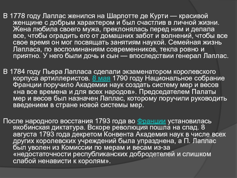 В 1778 году Лаплас женился на Шарлотте де Курти — красивой