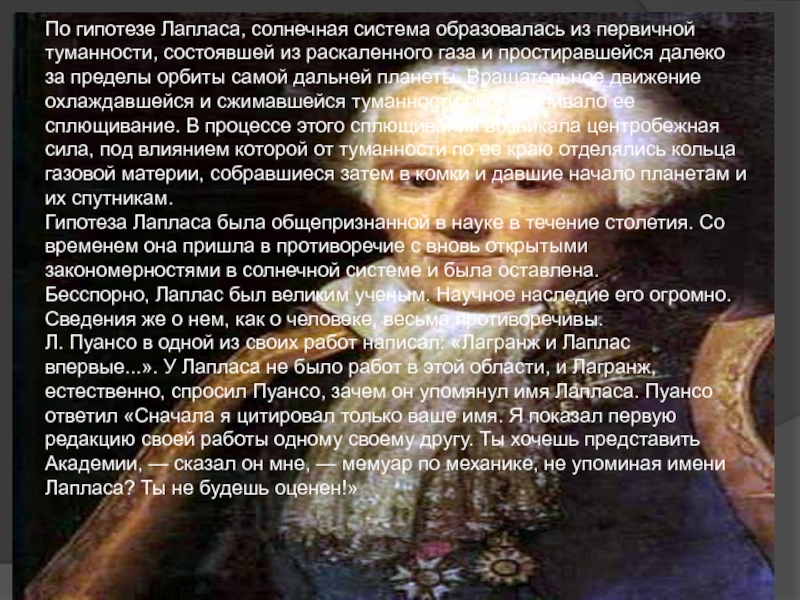 Пьер Лаплас, как и многие ученые того времени, не любил гипотез Только один раз он изменил этому правилу и «подобноКеплеру, Декарту, Лейбницу и Бюффону вступил в область гипотез, относящихся к космогонии» Космогоническая гипотеза Лапласа была опубликована в 1796 году в приложении к его книге «Наложение системы мира».