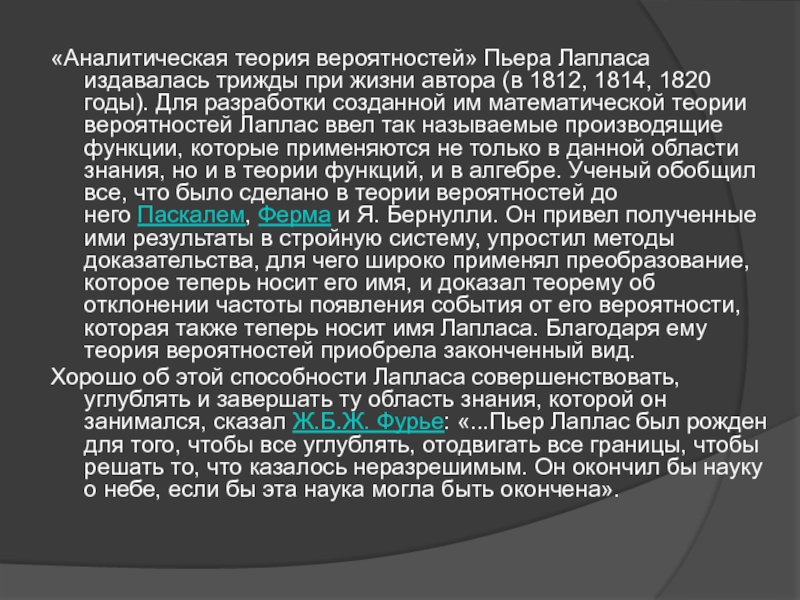 1812, 1814, 1820 годы). Для разработки созданной им математической теории вероятностей Лаплас ввел так называемые производящие функции, которые применяются не только в данной области знания, но и в теории функций, и в алгебре. Ученый обобщил все, что было сделано в теории вероятностей до него Паскалем, Ферма и Я. Бернулли. Он привел полученные ими результаты в стройную систему, упростил методы доказательства, для чего широко применял преобразование, которое теперь носит его имя, и доказал теорему об отклонении частоты появления события от его вероятности, которая также теперь носит имя Лапласа. Благодаря ему теория вероятностей приобрела законченный вид.