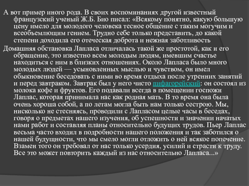 Домашняя обстановка Лапласа отличалась такой же простотой, как и его обращение, это известно всем молодым людям, имевшим счастье находиться с ним в близких отношениях. Около Лапласа было много молодых людей — усыновленных мыслью и чувством, он имел обыкновение беседовать с ними во время отдыха после утренних занятий и перед завтраком. Завтрак был у него чисто пифагорейский: он состоял из молока кофе и фруктов. Его подавали всегда в помещении госпожи Лаплас, которая принимала нас как родная мать. В то время она была очень хороша собой, а по летам могла быть нам только сестрою. Мы, нисколько не стесняясь, проводили с Лапласом целые часы в беседах, говоря о предметах нашего изучения, об успешности и значении начатых нами работ и составляя планы относительно будущих трудов. Пьер Лаплас весьма часто входил в подробности нашего положения и так заботился о нашей будущности, что мы смело могли отложить о ней всякое попечение. Взамен того он требовал от нас только усердия, усилий и страсти к труду. Все это может повторить каждый из нас относительно Лапласа...»