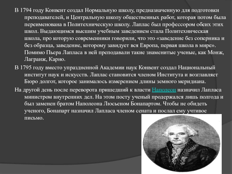 и Центральную школу общественных работ, которая потом была переименована в Политехническую школу. Лаплас был профессором обеих этих школ. Выдающимся высшим учебным заведением стала Политехническая школа, про которую современники говорили, что это «заведение без соперника и без образца, заведение, которому завидует вся Европа, первая школа в мире». Помимо Пьера Лапласа в ней преподавали такие знаменитые ученые, как Монж, Лагранж, Карно.