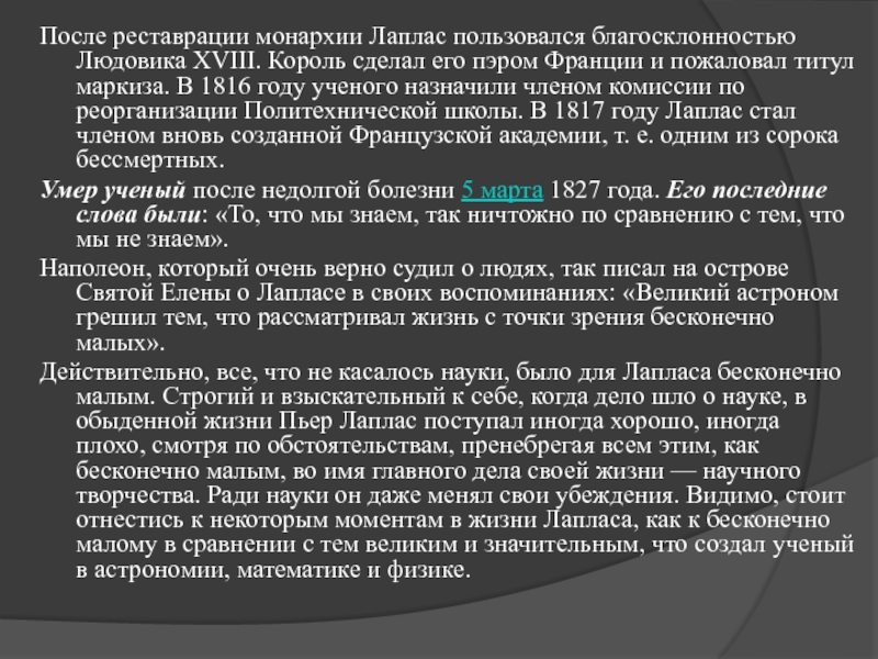 Слайд 15После реставрации монархии Лаплас пользовался благосклонностью Людовика XVIII. Король сделал его