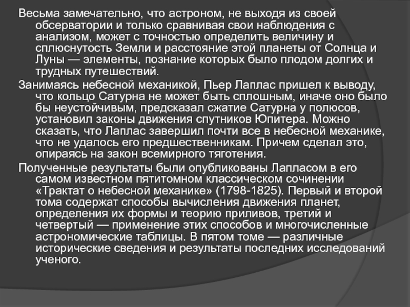 Занимаясь небесной механикой, Пьер Лаплас пришел к выводу, что кольцо Сатурна не может быть сплошным, иначе оно было бы неустойчивым, предсказал сжатие Сатурна у полюсов, установил законы движения спутников Юпитера. Можно сказать, что Лаплас завершил почти все в небесной механике, что не удалось его предшественникам. Причем сделал это, опираясь на закон всемирного тяготения.