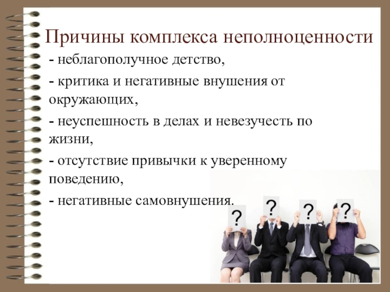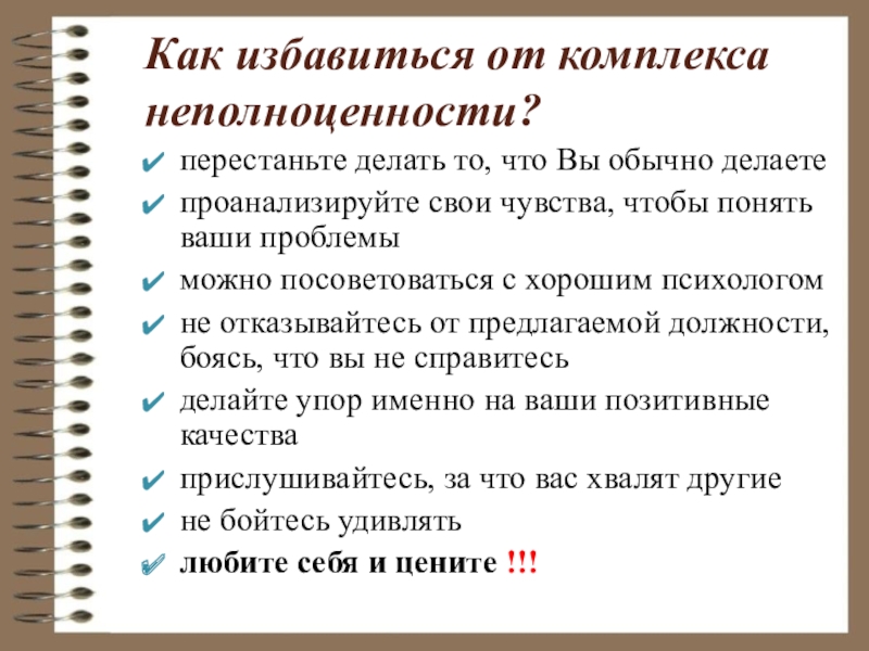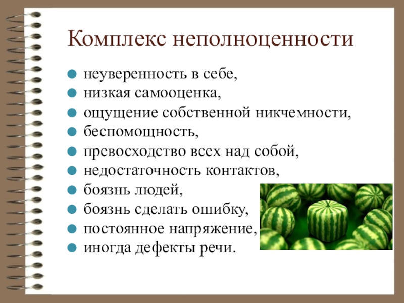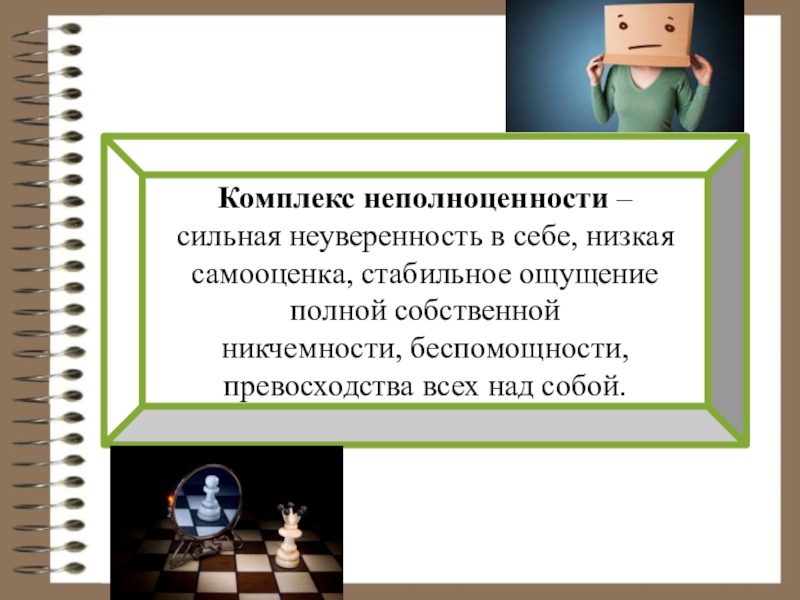 Слайд 28Комплекс неполноценности – сильная неуверенность в себе, низкая самооценка, стабильное ощущение полной собственной никчемности, беспомощности,