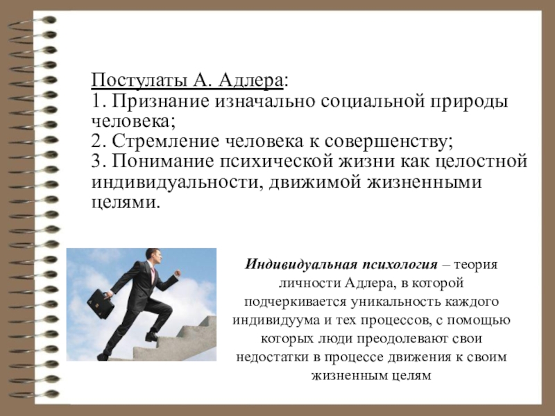 Индивидуальная психология – теория личности Адлера, в которой подчеркивается уникальность каждого индивидуума и тех процессов, с помощью которых люди преодолевают свои недостатки в процессе движения к своим жизненным целям