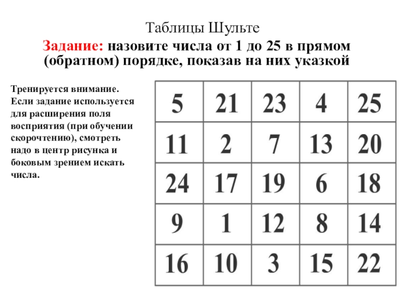 Задание: назовите числа от 1 до 25 в прямом (обратном) порядке, показав