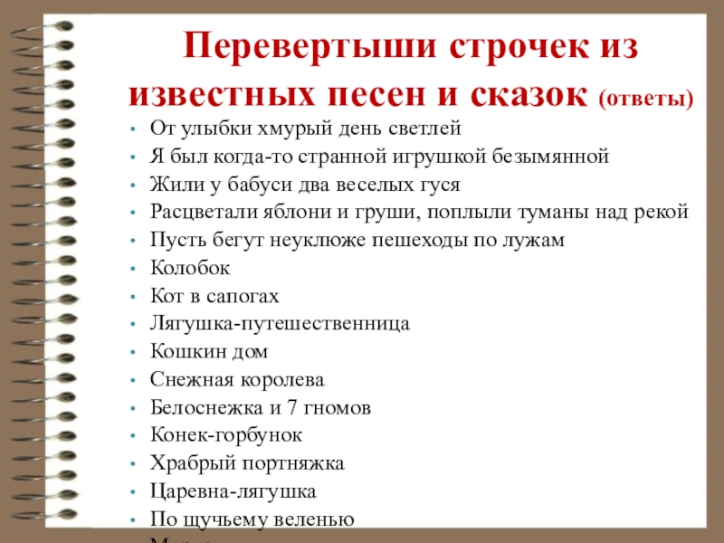 Слайд 164Перевертыши строчек из известных песен и сказок (ответы)