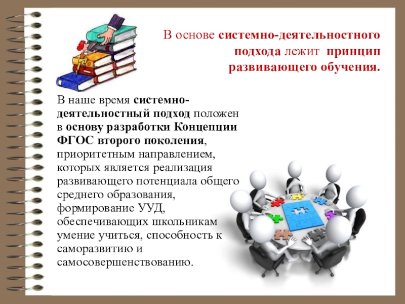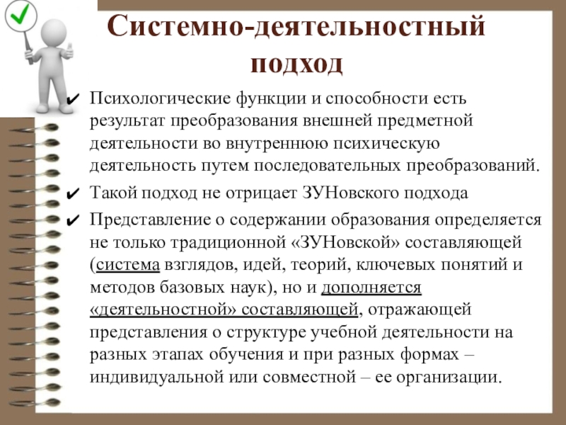Представление о содержании образования определяется не только традиционной «ЗУНовской» составляющей (система взглядов, идей, теорий, ключевых понятий и методов базовых наук), но и дополняется «деятельностной» составляющей, отражающей представления о структуре учебной деятельности на разных этапах обучения и при разных формах – индивидуальной или совместной – ее организации.