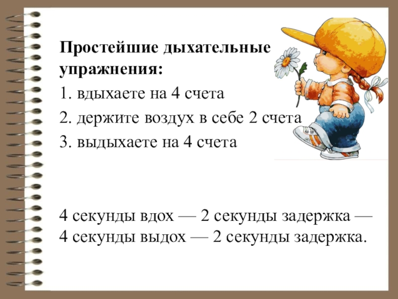 4 секунды вдох — 2 секунды задержка — 4 секунды выдох — 2 секунды задержка.