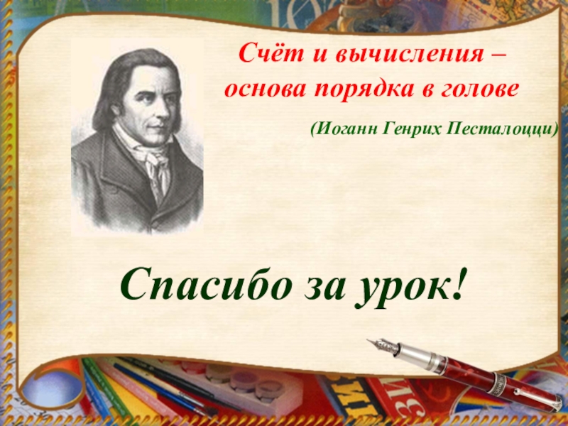 Счёт и вычисления – основа порядка в голове  Спасибо за урок!(Иоганн Генрих Песталоцци)
