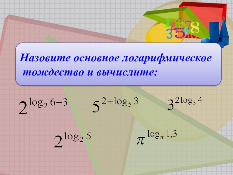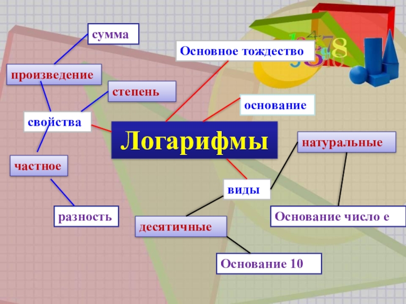 ЛогарифмыоснованиестепеньдесятичныенатуральныесвойствапроизведениечастноеОсновное тождествовидыОснование 10Основание число есуммаразность