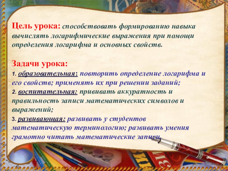 Слайд 3Цель урока: способствовать формированию навыка вычислять логарифмические выражения при помощи определения