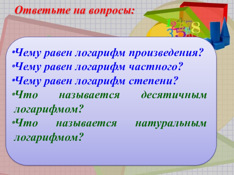 Ответьте на вопросы:Чему равен логарифм произведения?Чему равен логарифм частного?Чему равен логарифм степени?Что называется десятичным  логарифмом?Что называется