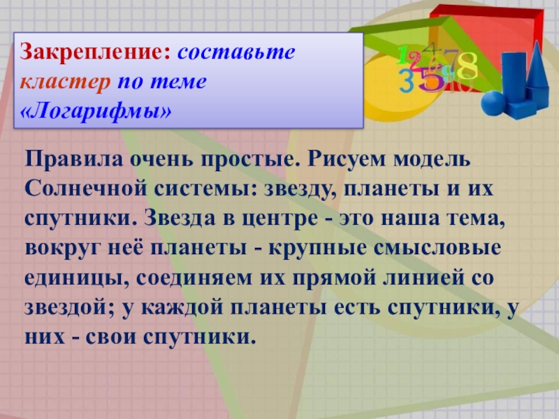 Закрепление: составьте кластер по теме «Логарифмы»Правила очень простые. Рисуем модель Солнечной системы: звезду, планеты и их спутники.
