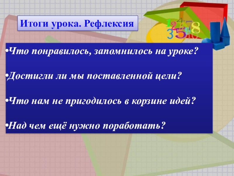 Итоги урока. РефлексияЧто понравилось, запомнилось на уроке?Достигли ли мы поставленной цели? Что нам не пригодилось в корзине