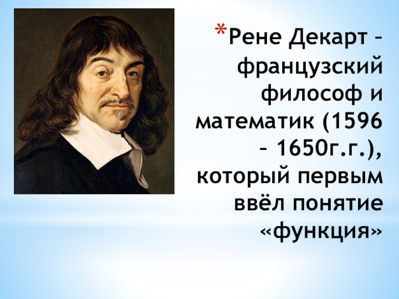 Рене Декарт – французский философ и математик (1596 – 1650г.г.), который первым ввёл понятие «функция»
