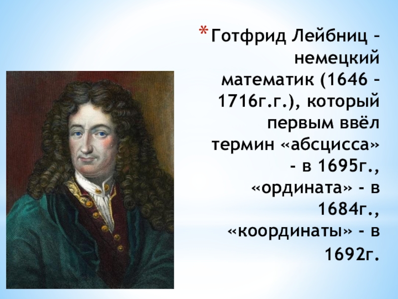 Готфрид Лейбниц – немецкий математик (1646 – 1716г.г.), который первым ввёл термин «абсцисса» - в 1695г., «ордината»