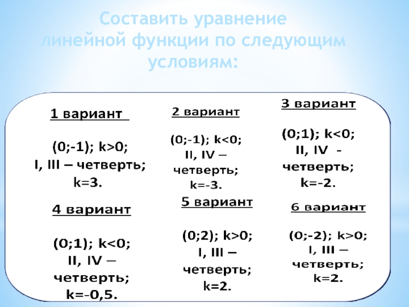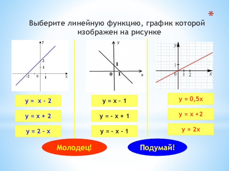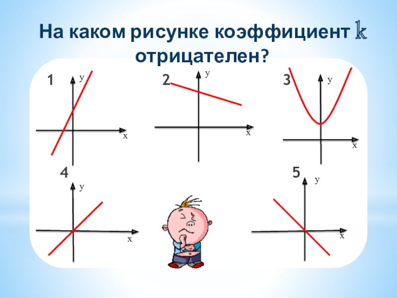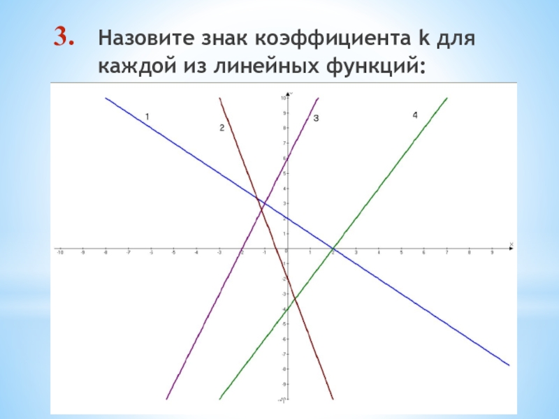 Слайд 22Назовите знак коэффициента k для каждой из линейных функций: